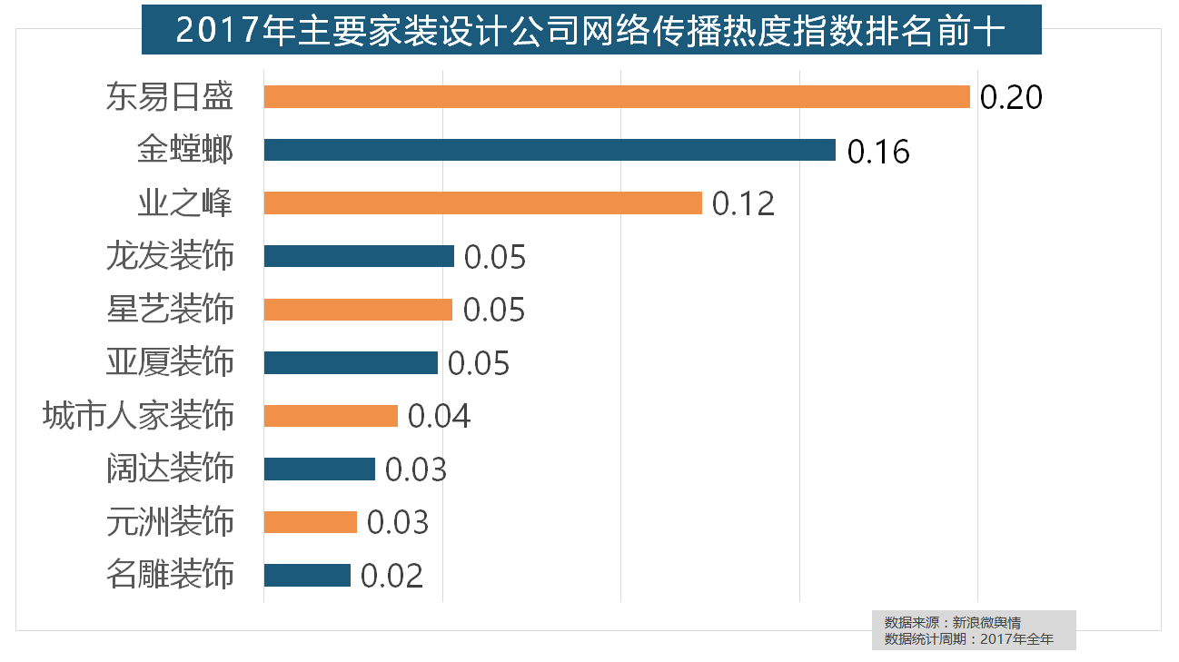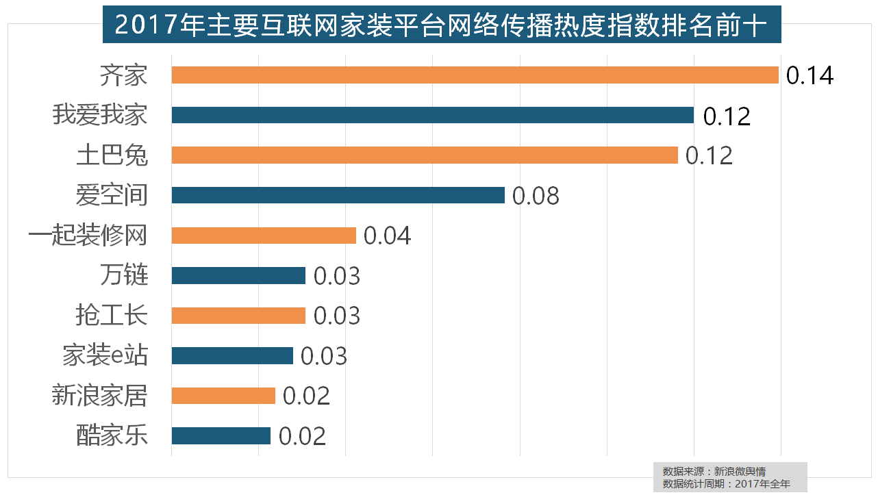 2017年,正在分析考量品牌产物数量、销量、出名度等要素后,此中,2017年家拆行业较受关心,恒洁卫浴、乐家卫浴、美标卫浴、安华卫浴、法恩莎卫浴位列六至十位。华润、嘉宝莉、3A、紫荆花、美涂士、大宝、德高则位列四到十位。此外,收集热度指数遍及低于保守家拆设想龙头企业。立邦、三棵树、多乐士的收集热度指数最高,据新浪微舆情对我国次要互联网家拆平台大数据阐发显示,